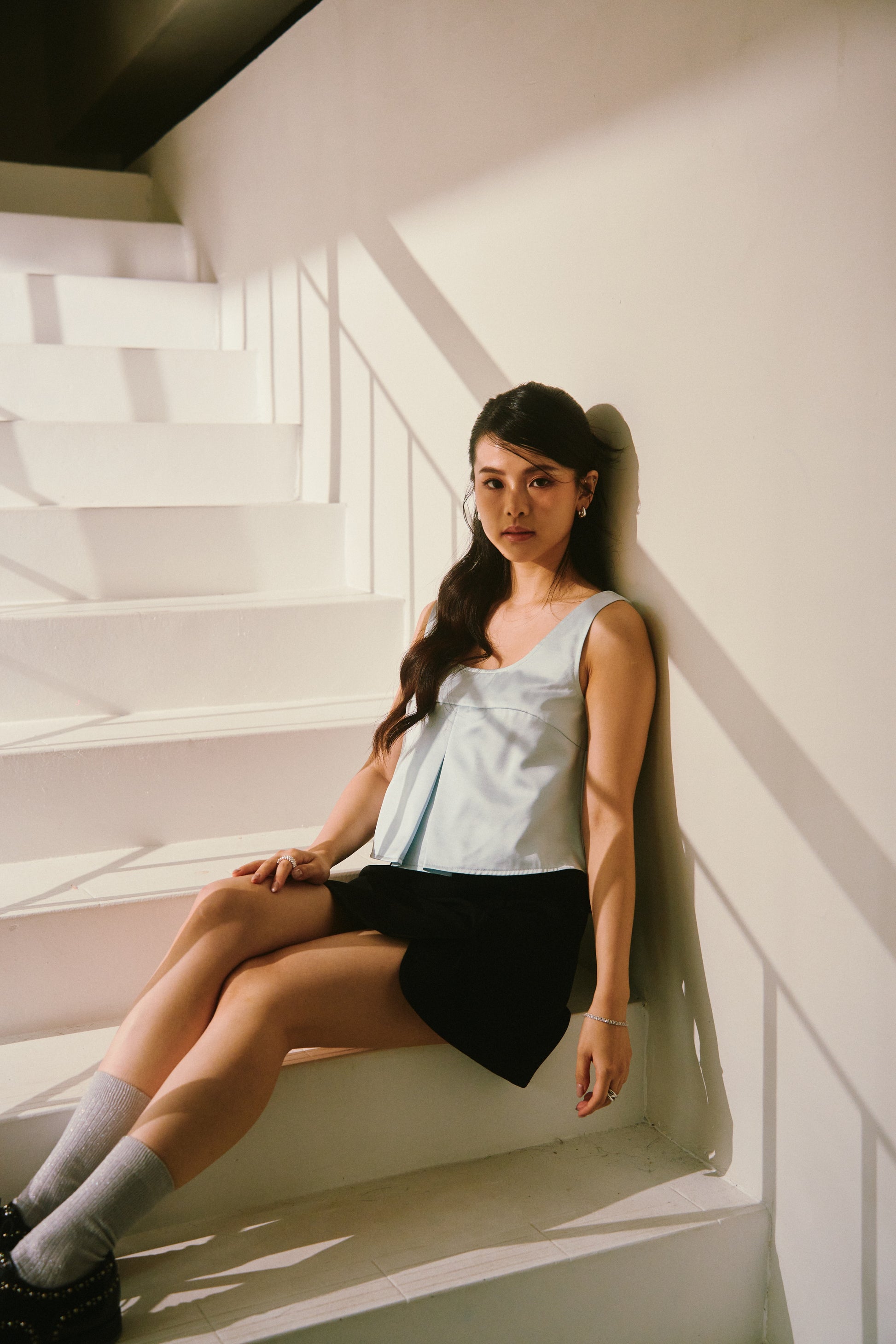 Structured sleeveless top with a double welted pocket and a centre pleat. Fully lined.