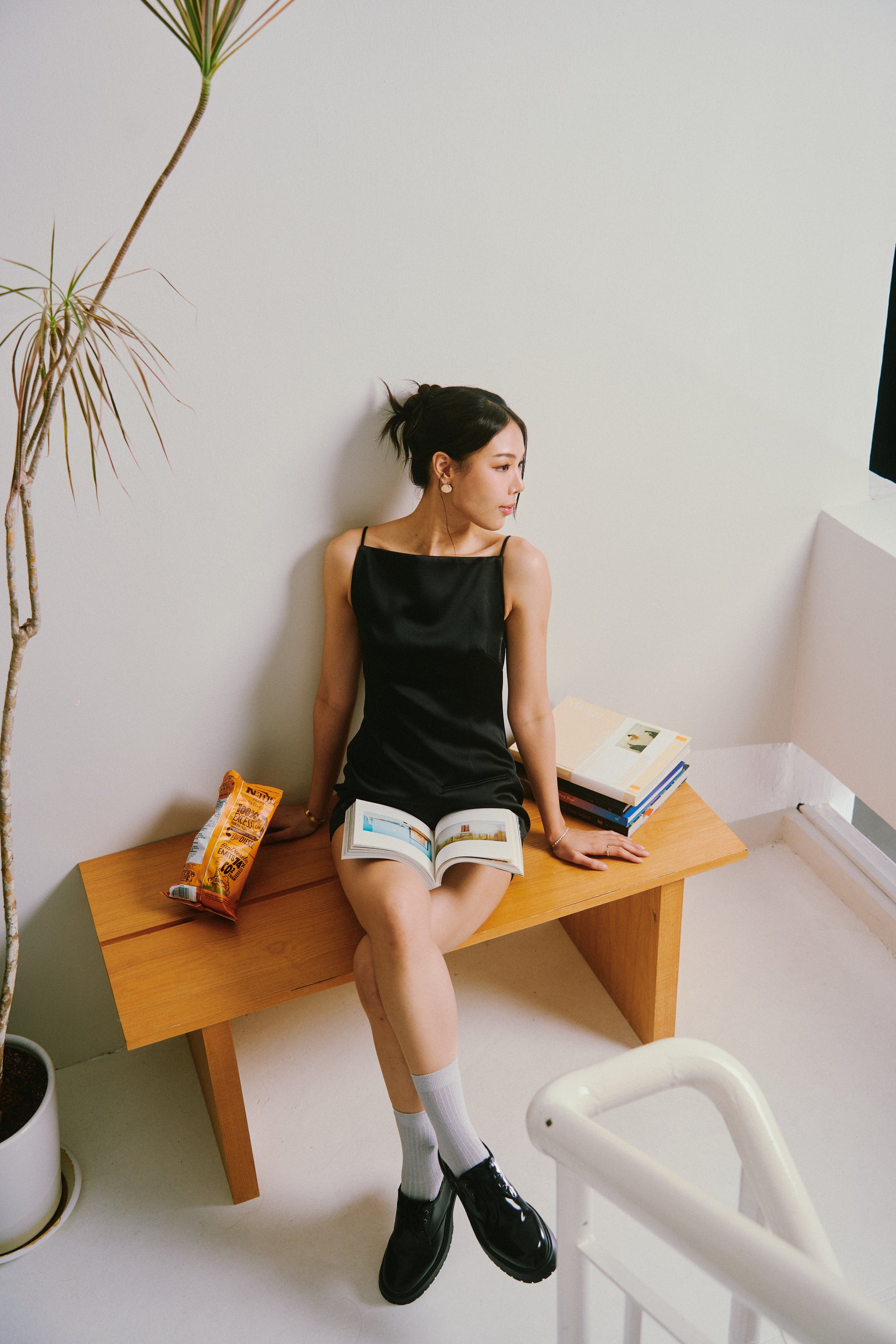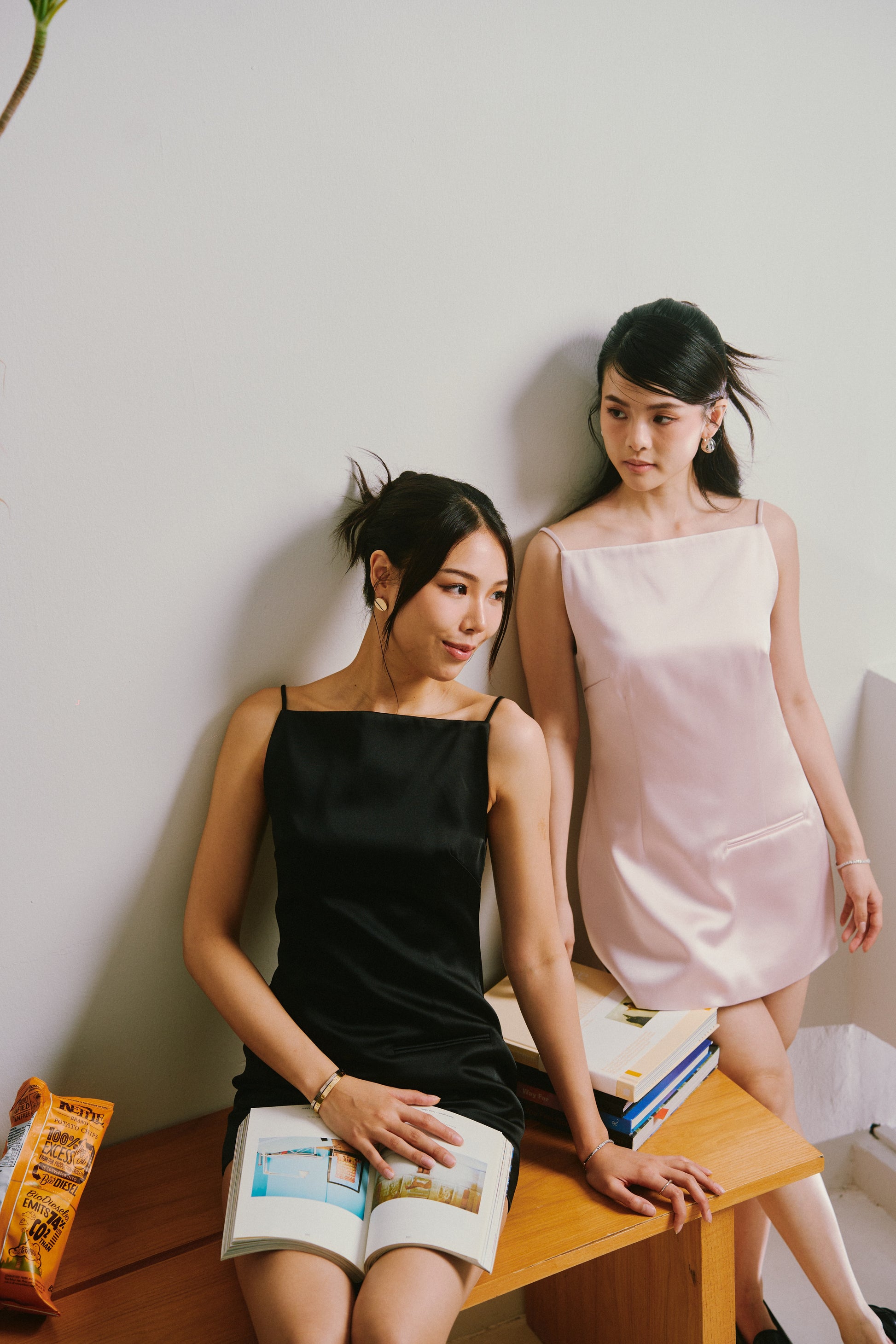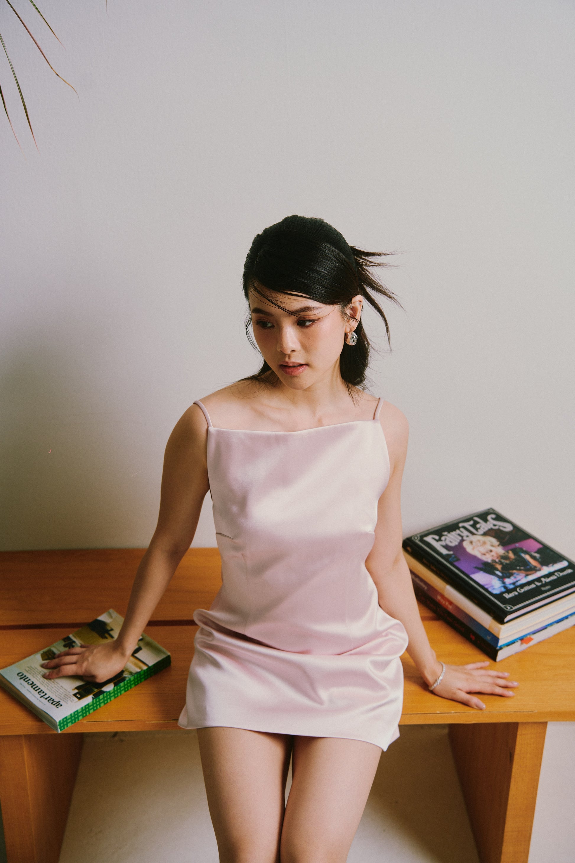 Structured Mini Dress crafted from glossy satin. A contemporary take on classic design.