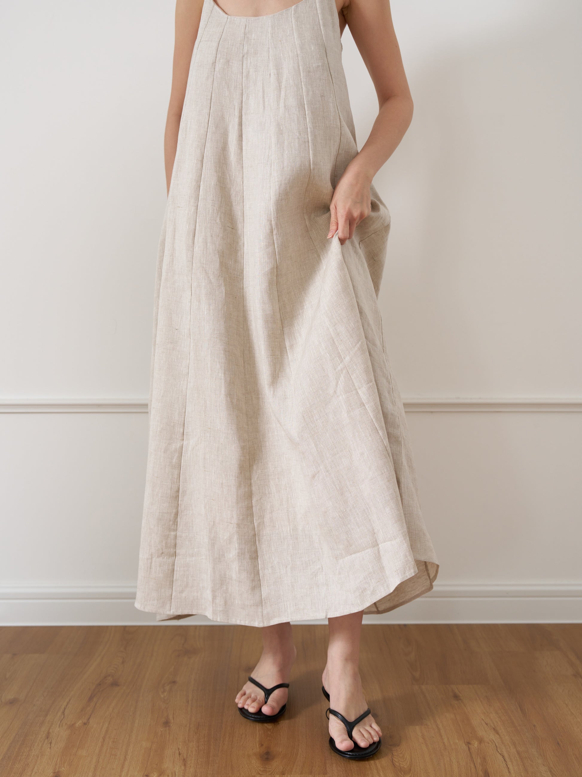 Ankle-length panelled strap dress with relaxed A-line silhouette.